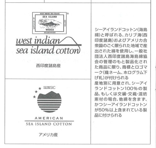 海島綿にはカリブとアメリカの二つの産地があること、ロゴマークが付けられる海島綿製品の条件など、海島綿協会が制定した「海島綿ガイドブック」の最新の内容を、添えられた説明文に反映していただいています。機会がありましたらご確認ください。