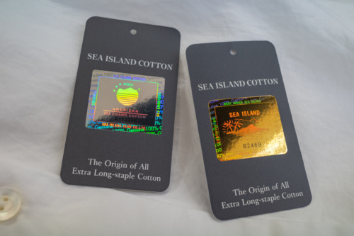 下げ札には登録商標をあしらったホログラムシールが貼られており、シールにはシリアルナンバー(重複無し)が刻印されており、弊社で番号管理しております。シリアルナンバーは製品に使われている糸と原料に紐づけられており、海島綿のトレーサビリティの要としてお客様に安心をご提供します。